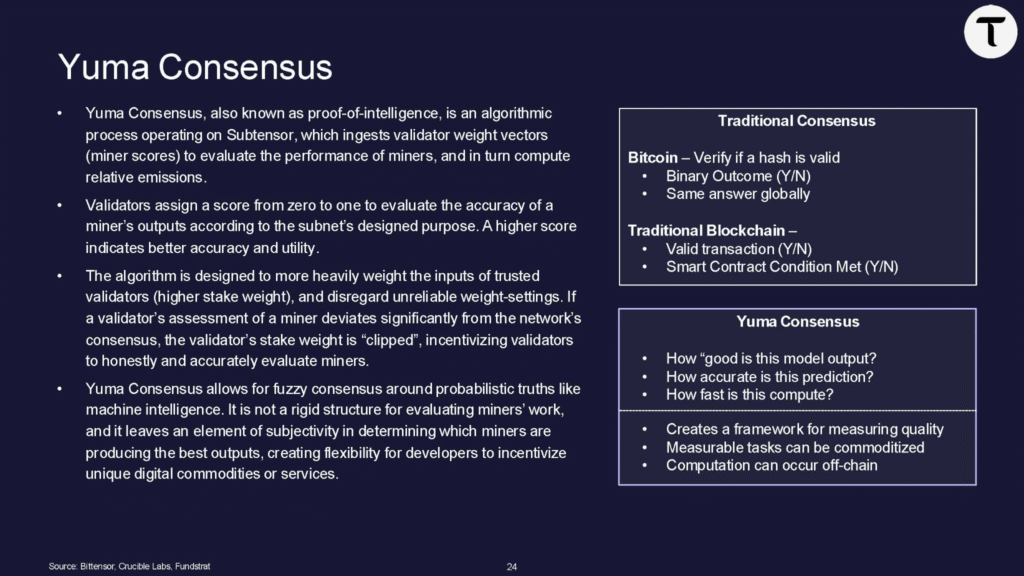 a. Yuma Consensus, Bittensor’s core βagreement mechanism,β then takes the combined weights submitted by all validators on a subnet and uses them to determine how emissions get distributed.