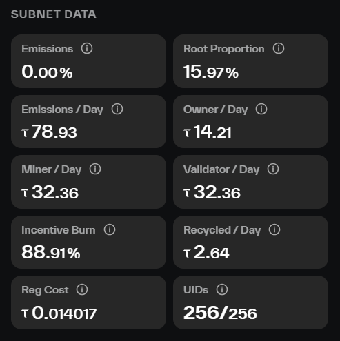 This is the section that most directly reflects how a subnet functions as an economic system. Everything here is denominated in $TAO, reinforcing that all incentives ultimately flow from the base network.