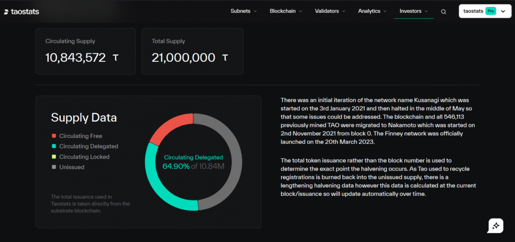a. Supply Dynamics: Circulating supply tells you how much $TAO is actively in the market, and Supply Distribution shows what form it’s being held and how it is spread across the ecosystem.