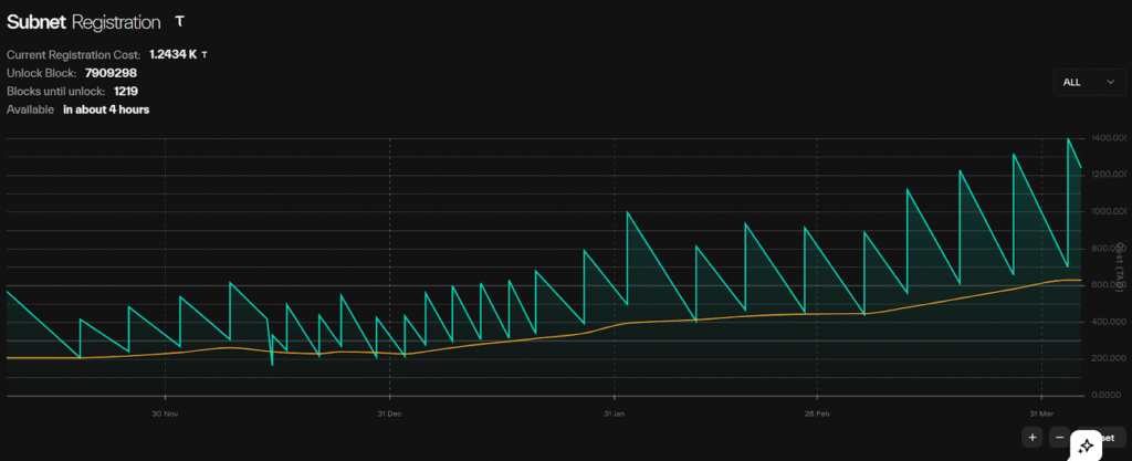 a. Registration cost remains elevated at approximately 1,245 $TAO (taken as at April 06),