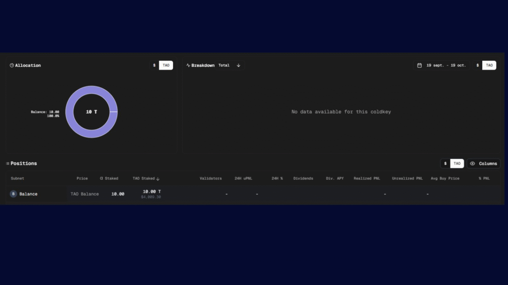 I bought 10 TAO at $400 each and then allocated those 10 TAO into dTAO. Here’s how I approached it: I distributed 0.2 TAO across 50 subnets to accumulate alpha tokens. (Of course, you can adapt the amount and the distribution, what truly matters is the 5–10 year time horizon.)