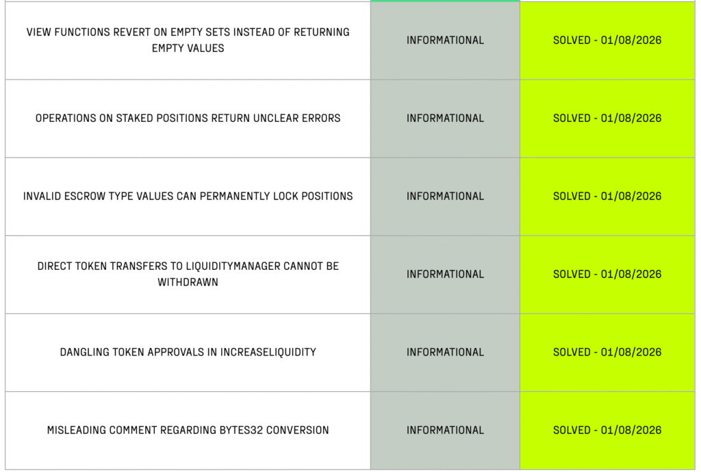 The remaining six findings focused on usability and maintainability. Things like view functions reverting on empty data, unclear error messages, dangling approvals, and the risk of stuck funds from direct token transfers.