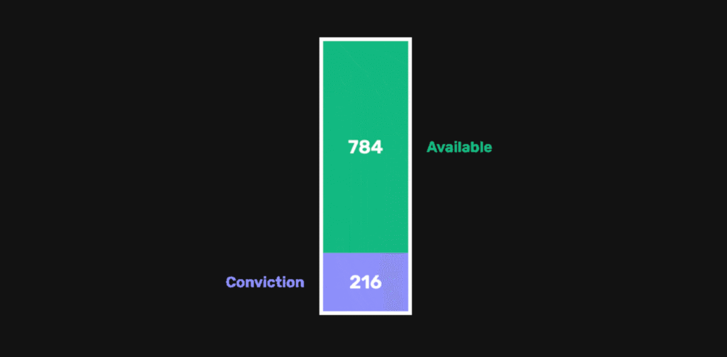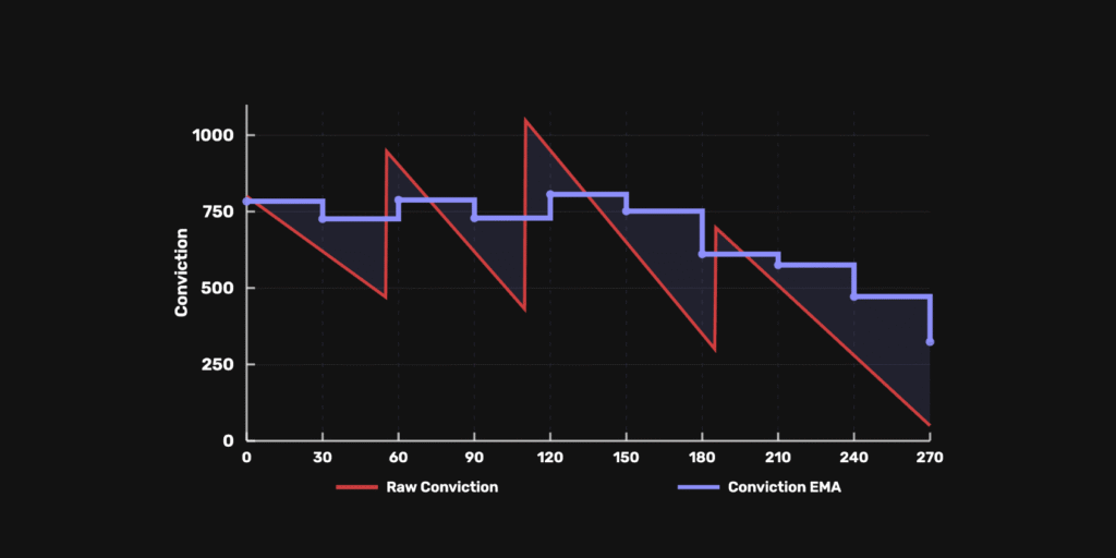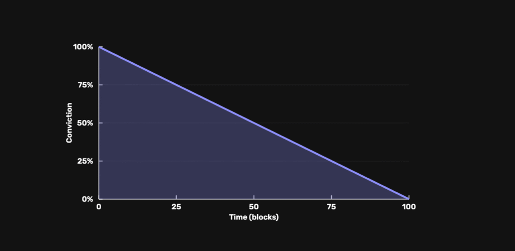 Conviction starts at 100% of the locked amount and decays linearly to zero as the lock approaches expiry. The longer you lock and the more you lock, the higher your conviction.