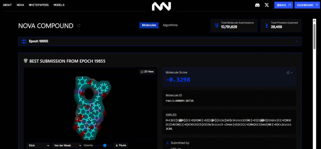 This is the problem NOVA Compound is designed to solve. Built on NOVA (Bittensor’s Subnet 68), NOVA Compound serves as a decentralized virtual drug screening platform where discovery is driven by competition, incentives, and continuous improvement.