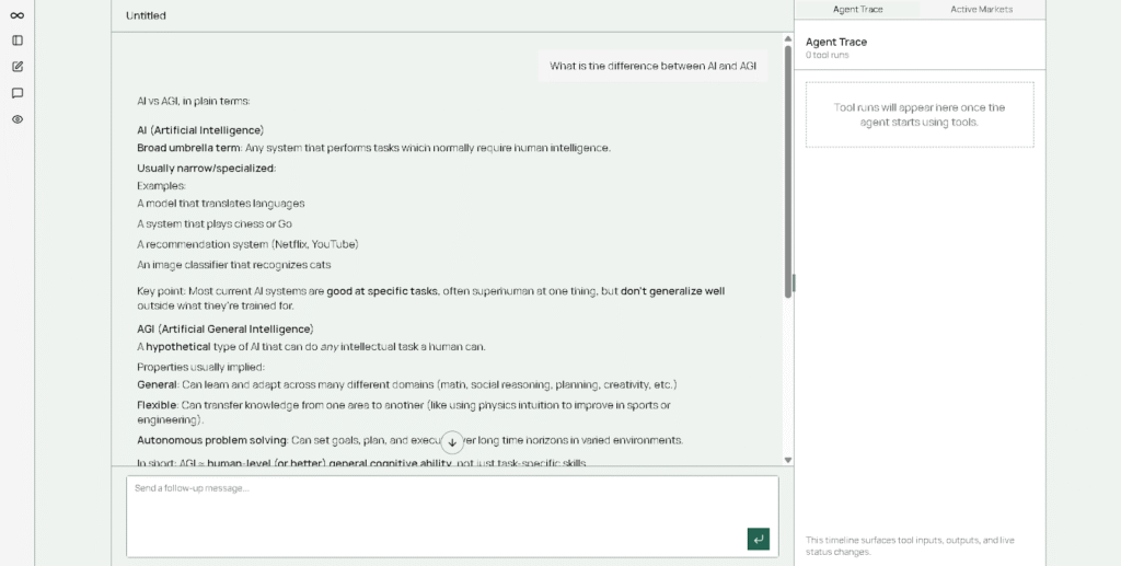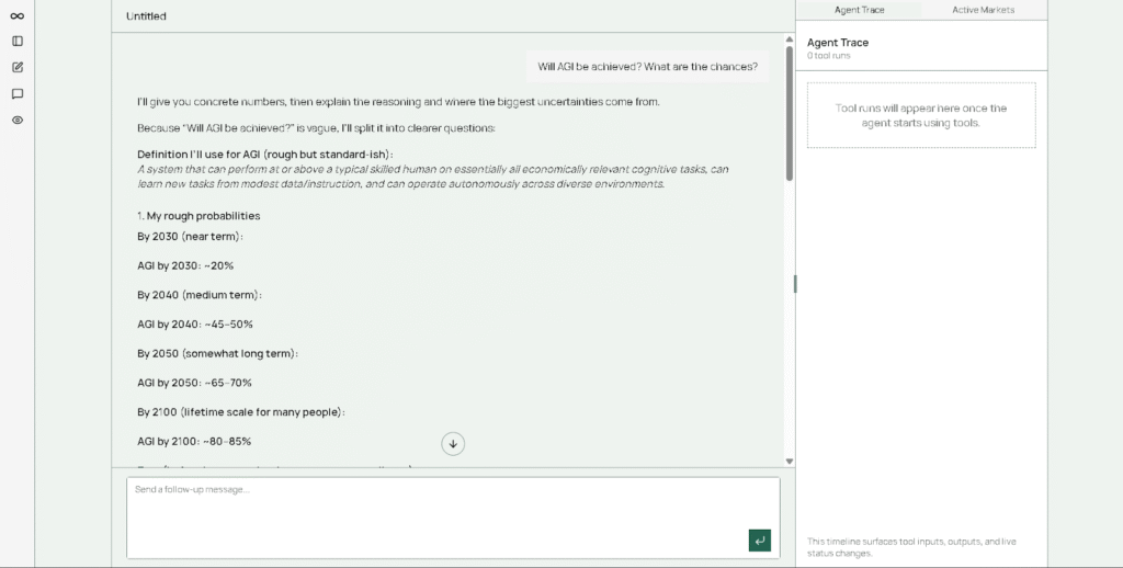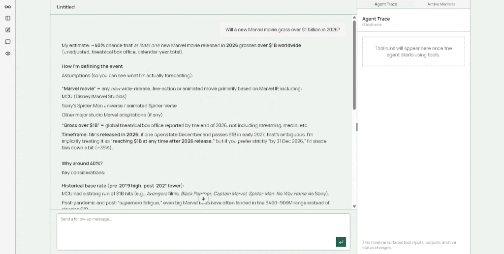 When you submit a prompt, it triggers a complex backend process. The output isn’t just a single, hallucinated guess. Instead, the platform delivers a highly detailed probabilistic estimate. The response breaks down the aggregate odds, showcasing transparent, traceable sources pulled from live prediction markets (like Polymarket and Kalshi), real-time news feeds, and social media sentiment.