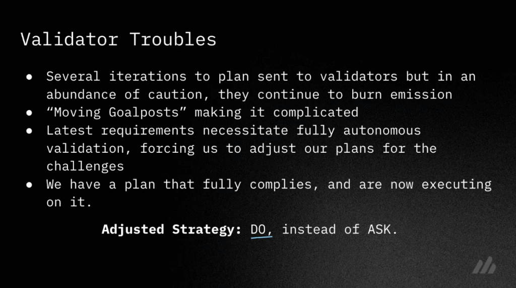 Progress on Subnet 63 continues, though Bob acknowledged ongoing friction with validators. He explained that the team has iterated multiple times on subnet design in response to validator feedback, often encountering shifting requirements.