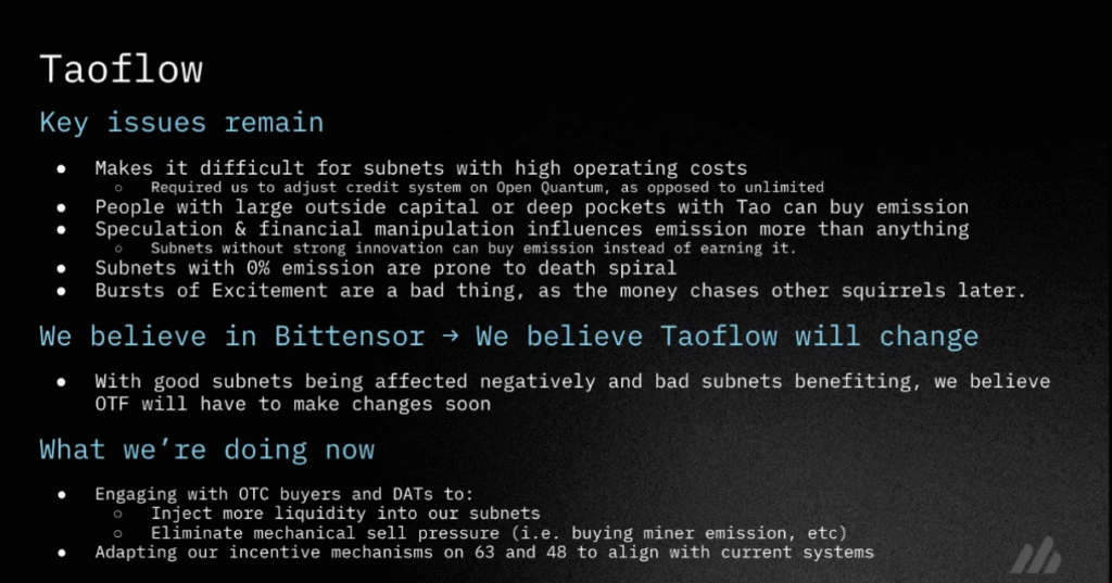 He noted that Taoflow can be of disadvantage to subnets with higher operating costs and may amplify speculative behavior, but framed these issues as part of the network’s learning process.