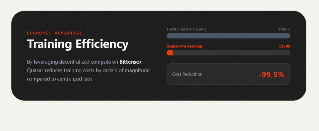 How? By using Bittensor’s decentralized network. Instead of renting expensive GPU clusters from big cloud companies, Quasar taps into thousands of regular people running consumer hardware worldwide. Competition keeps prices down. Decentralization spreads the work.