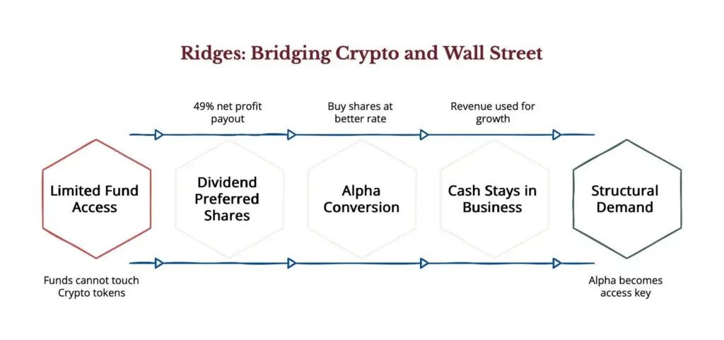 Ridges introduces a dividend-paying preferred share model, which allows investors to participate without directly holding crypto. With a 49% net profit payout, traditional investors can access blockchain-native upside while staying compliant.