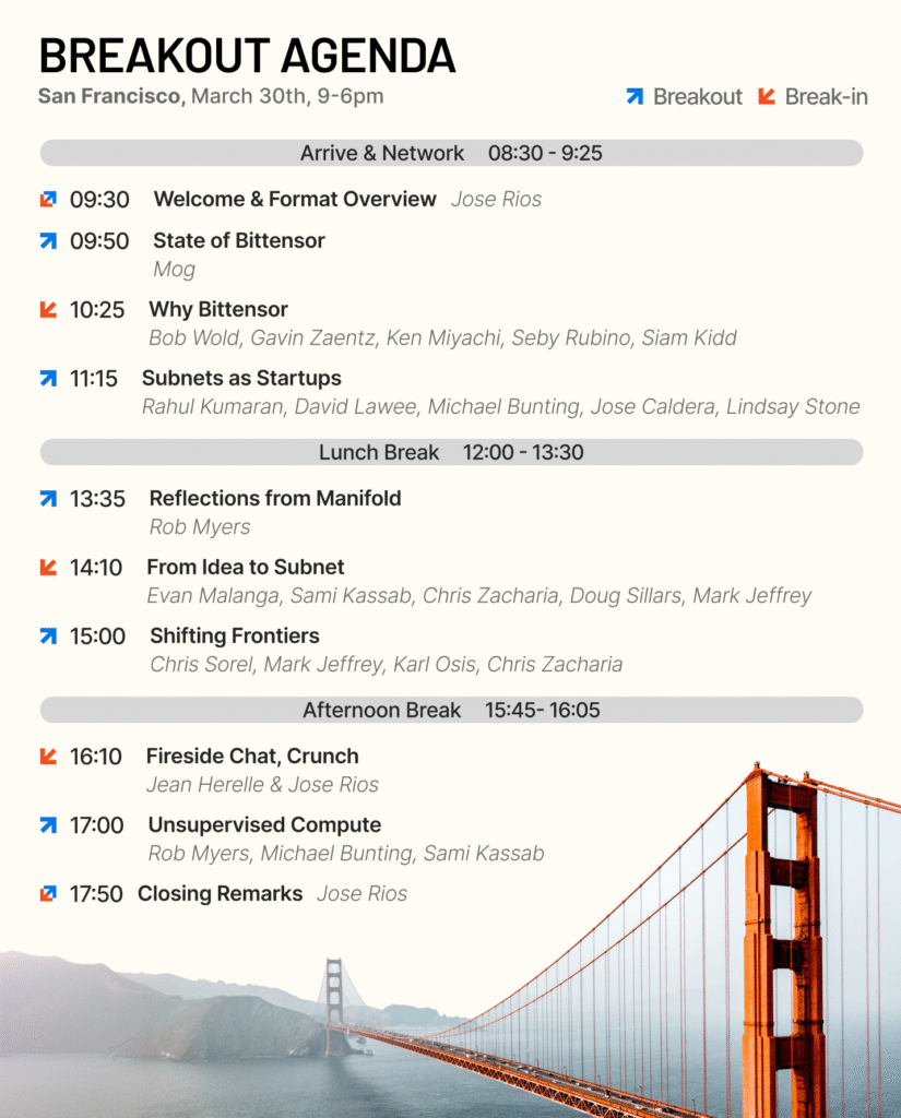 Breakout SF was not a typical conference of keynotes and panels. It was structured as a series of facilitated working sessions designed to take stock of where Bittensor actually stands (the forces pushing the protocol forward and the blockers the community needs to face together to take it to the next level).