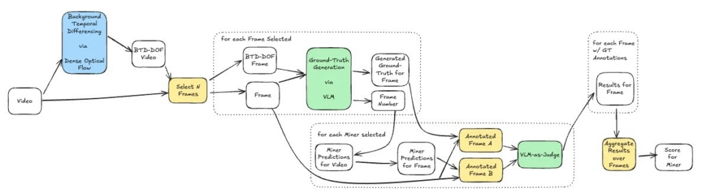 - A second VLM then evaluates the miners’ predictions against this pGT, determining which miner delivers the best performance.