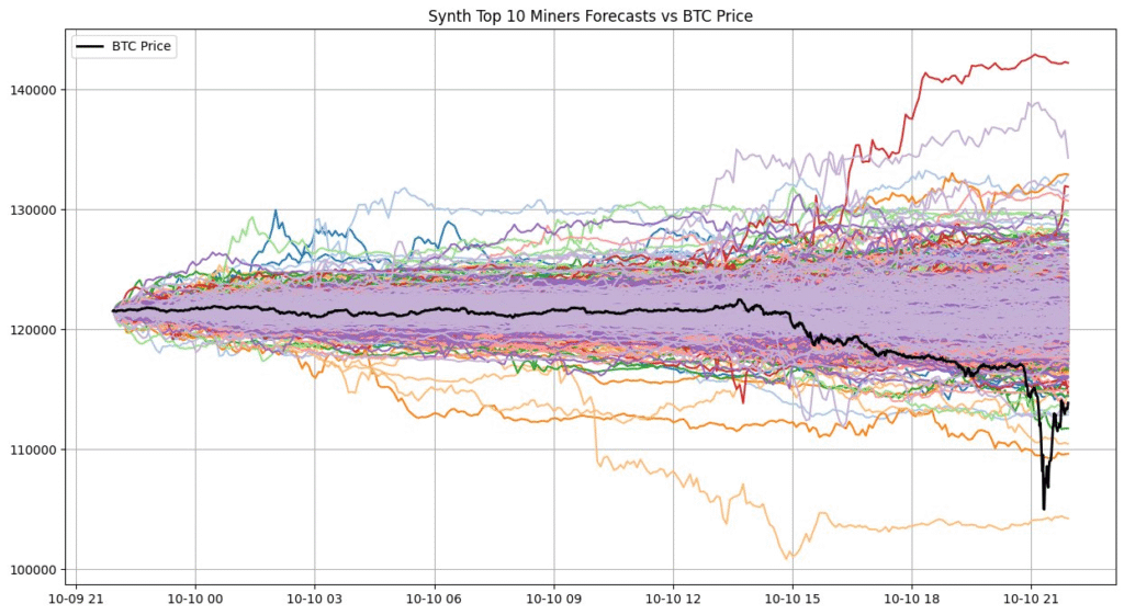Data from Synth’s top-performing models showed several forecast paths correctly capturing the extreme downside move that eventually occurred. This highlights the network’s ability to detect rare, non-linear risk events that conventional models typically overlook.