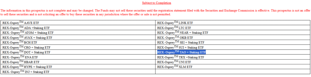REX Shares and Osprey Funds have filed for 21 new spot cryptocurrency (including TAO) exchange-traded funds (ETFs) with the U.S. Securities and Exchange Commission (SEC). Operating under Rex-Osprey™, the initiative seeks to bring a wide range of digital assets into the regulated ETF market — from Bittensor’s $TAO, $SUI to $HBAR.