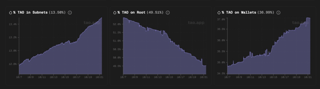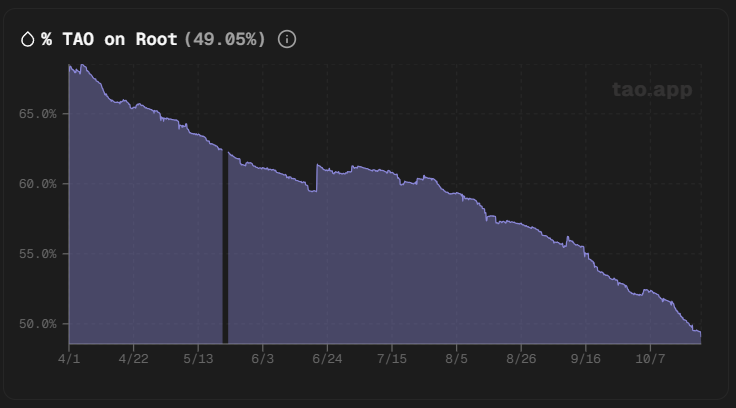 On-chain metrics show that as of today (October 23, 2025), the percentage of $TAO staked on the Root Network dropped to about 49.05%, marking the first time it has fallen below the 50% threshold. Earlier in the year, Root staking hovered around 65%.