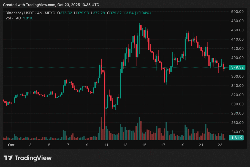 As of October 23, 2025, TAO trades around $388.40, with a market capitalization of $3.94 billion and a 24-hour trading volume of $300 million. This marks a strong recovery from early October levels near $300, a gain of more than 35% within the month, to local highs of around $480.