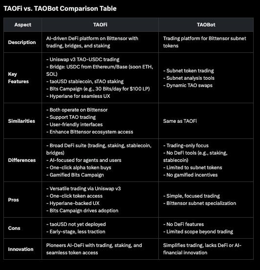 Its one-click alpha token access and Bits Campaign (e.g., 100 Bits for following @taofi on X) drive adoption, setting it apart from TAOBot’s trading-only focus. Hyperlane’s interchain infrastructure further enhances TAOFi’s seamless UX, making it a revolutionary financial layer for decentralized AI