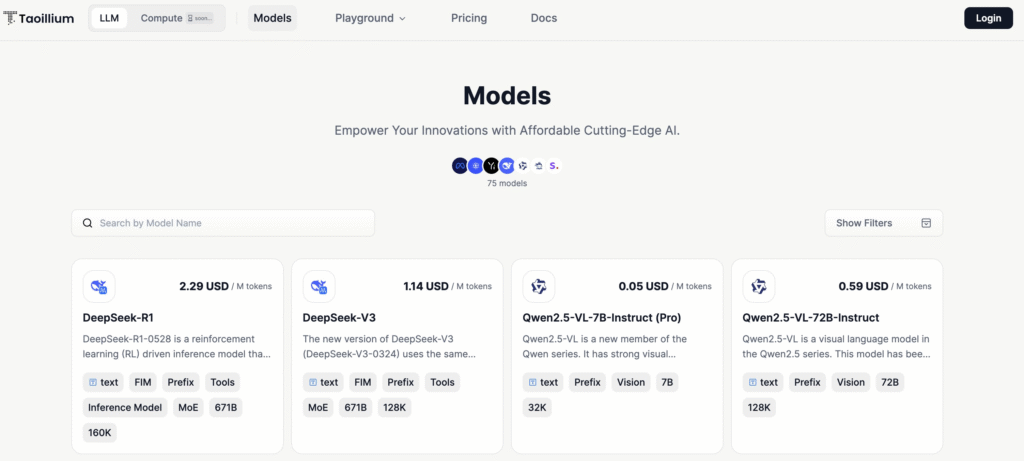 Taoillium is an innovative AI platform designed to empower users with cutting-edge generative AI tools and computing resources. Developed by a team focused on accessibility and performance, Taoillium (SN109) offers a range of models, including DeepSeek-V2 and Qwen2-72B-Instruct, starting at just 0.68 USD per use.