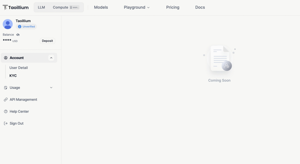 Beyond AI models, Taoillium provides Taoillium-Compute, a resource pool of CPU, memory, and cloud storage, allowing users to run diverse workloads without managing physical hardware. With a commitment to security, the platform requires KYC (Know Your Customer) verification, ensuring a regulated and safe environment for AI exploration.