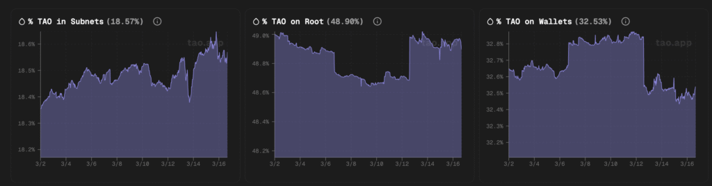 Bittensor’s first-ever halving landed on December 15, 2025. Daily TAO emissions dropped from 7,200 to 3,600, a 50% supply cut, modeled directly on Bitcoin’s scarcity playbook. With north of 67% of circulating supply staked in root and locked into subnet pools, the supply on exchanges is increasingly trending downwards. Basic economics takes over from there: shrink the supply while demand is rising, and prices move. Fast.