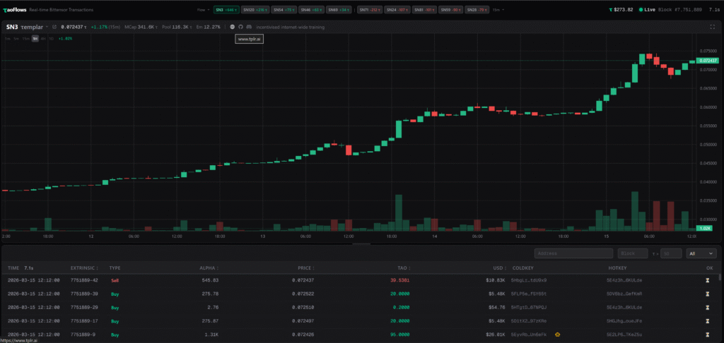 But the downstream effect on TAO itself was arguably more important: buying subnet tokens requires holding TAO first, so every spike in subnet demand funnels directly into base-layer buying pressure.