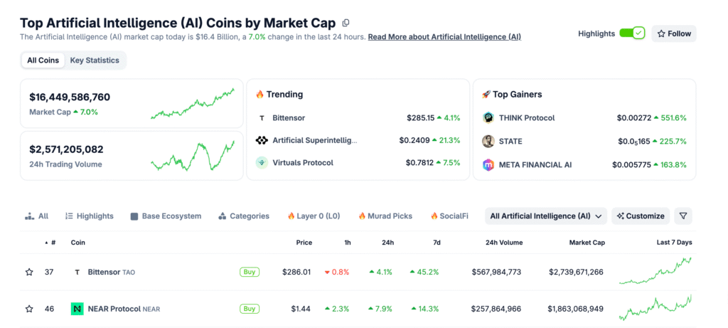 TAO benefits disproportionately from this dynamic. As the largest AI crypto asset by market cap, Bittensor saw a significant gain in its token value too. Daily trading volumes have regularly topped $300–500 million during this period.