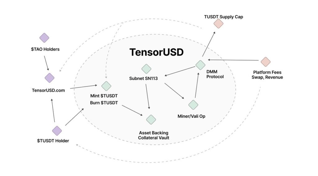 Keeping a stablecoin pegged to a dollar is harder than it sounds. Many algorithmic stablecoins have failed catastrophically when their mechanisms broke down. TensorUSD uses what they call the “Trinity Algo“, a three-token system involving TensorUSD itself, TAO as collateral, and a subnet alpha token. These three work together to maintain stability.