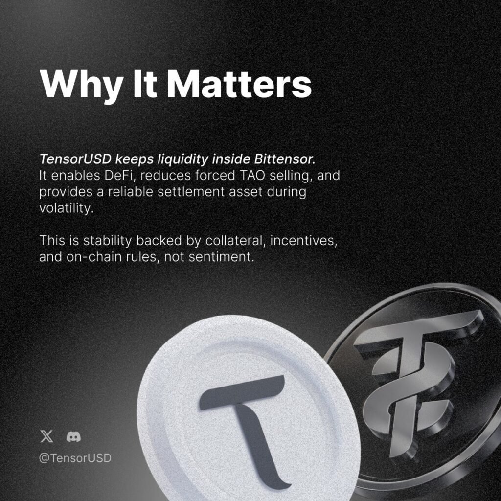 For users, TensorUSD enables staying in the Bittensor ecosystem during market volatility. You can hold TensorUSD when things are uncertain, use it in DeFi protocols that require stable value, or accumulate TAO gradually without worrying about timing the market perfectly.