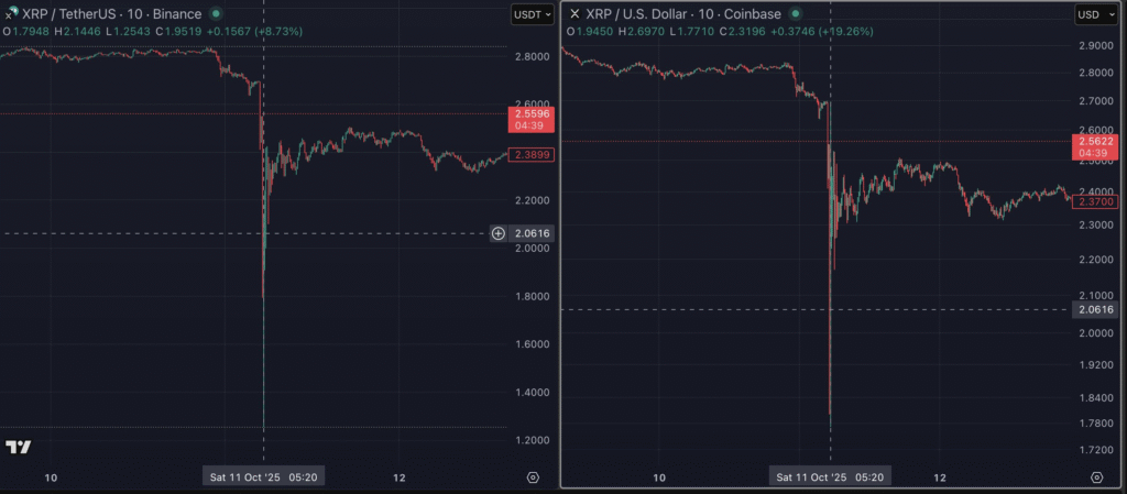 Binance, long regarded for its deep spot liquidity, experienced unprecedented price dislocations across multiple tokens. As the world’s largest offshore exchange, its outsized influence caused USDT-based venues to mirror the collapse, while USD-pair platforms remained comparatively stable.