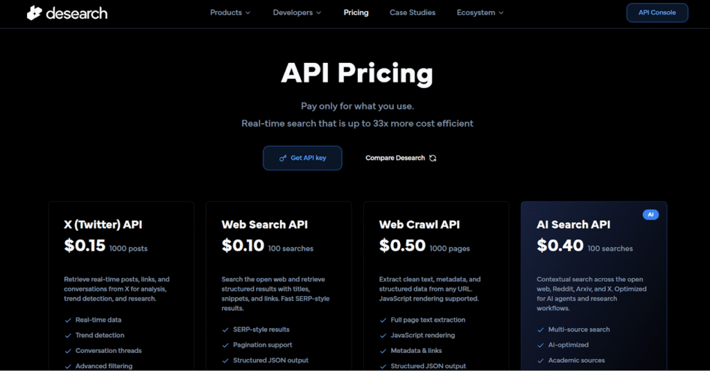Desearch operates on a usage-based API pricing structure: