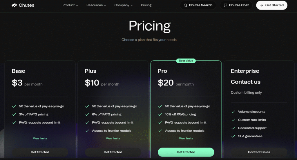 Chutes combines subscription and usage pricing: