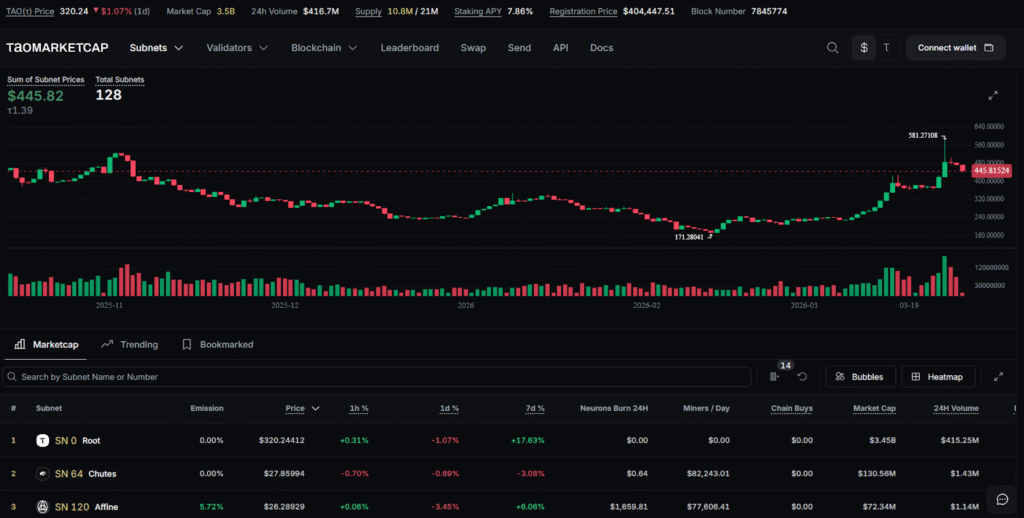 TaoMarketCap simplifies the complexity of subnet economics into a clear, market-style overview that highlights emissions, valuations, and relative positioning. It allows users to quickly identify which subnets are gaining traction and which are losing relevance without needing to dig through raw data.
