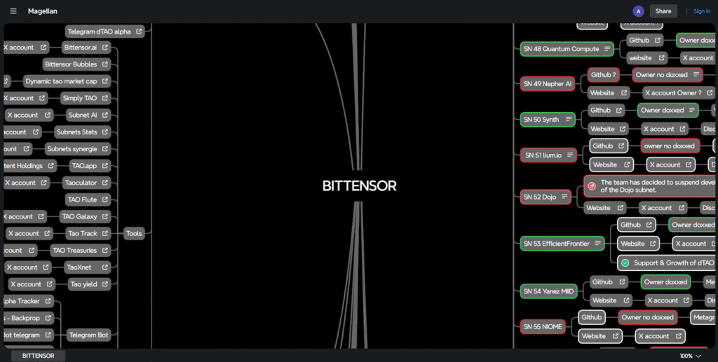 Magellan is a framework for understanding Bittensor as a connected and evolving system. It aggregates ecosystem knowledge, maps relationships, and continuously updates to reflect structural changes across the network.