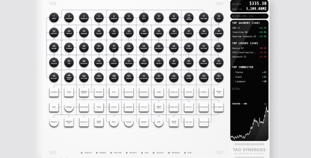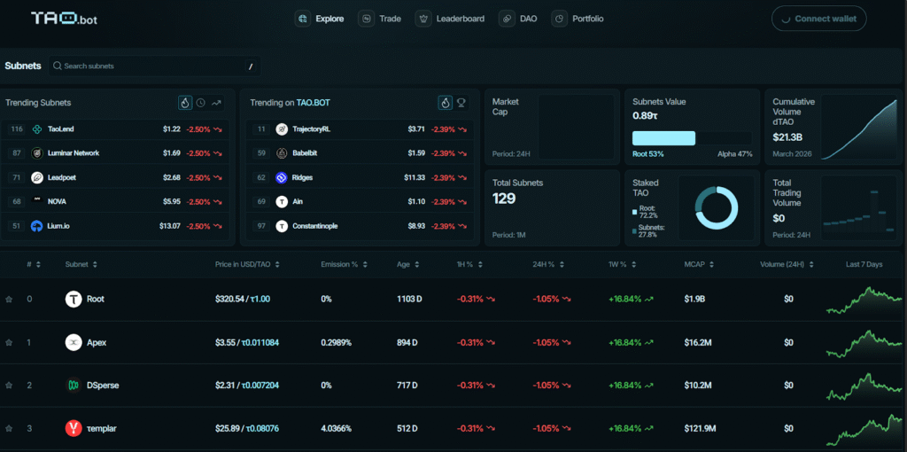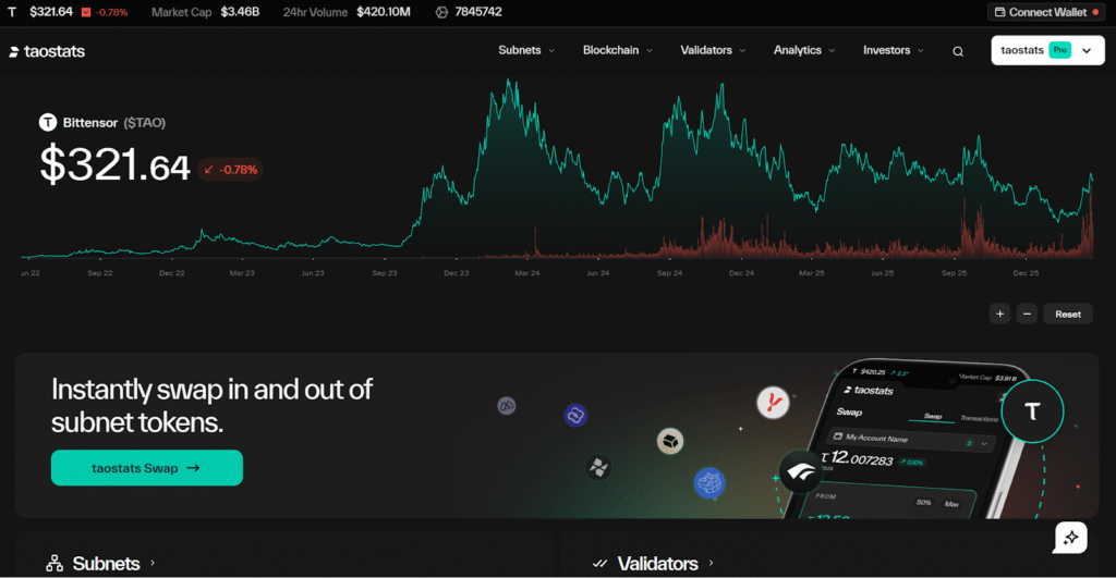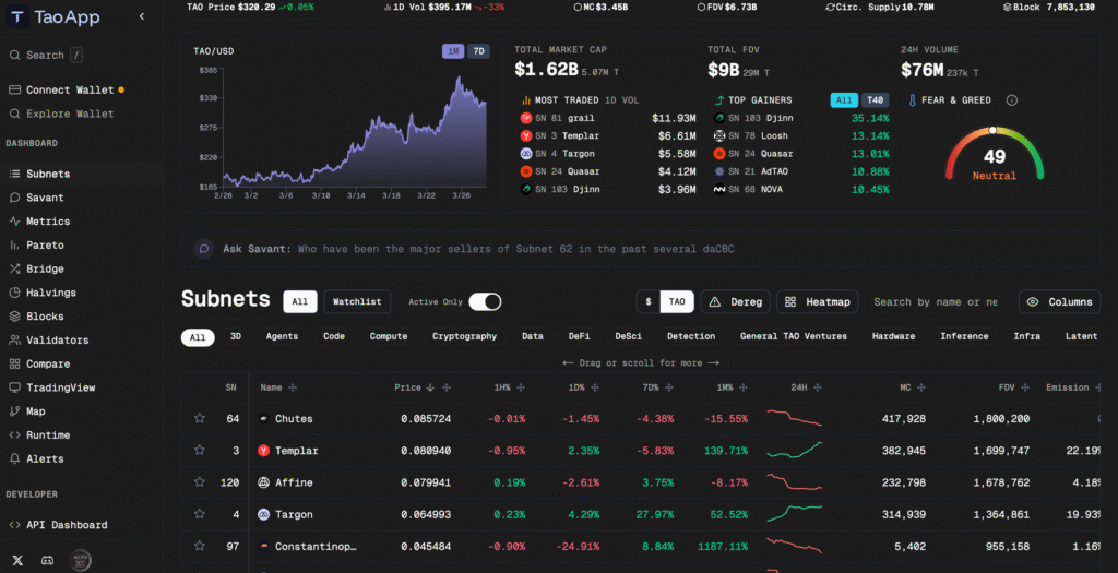 TAO.app combines subnet tracking with AI-powered interaction, offering portfolio tools, comparative analysis, and an integrated chatbot that helps interpret network data in real time. It moves beyond static dashboards by introducing a layer of intelligence that assists users in navigating complexity more efficiently.