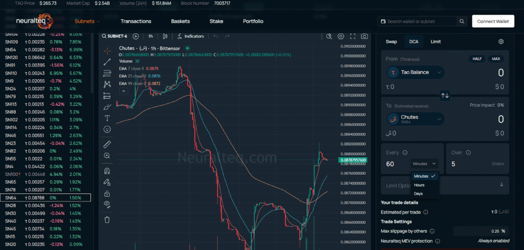 Break your orders into smaller pieces using TWAP or DCA. Adopt trusted tools and Bittensor-centric solutions like Neutralteq and TaoApp.
