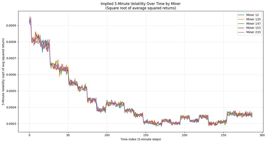 Notably, miner curves are nearly indistinguishable across all horizons. This tight alignment suggests miners are converging on a shared volatility structure rather than producing idiosyncratic dynamics.