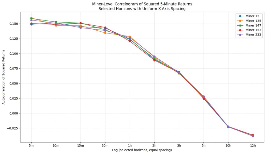 Using Synth miner predictions at a five-minute resolution, the autocorrelation of squared returns reveals a clear and coherent volatility memory.