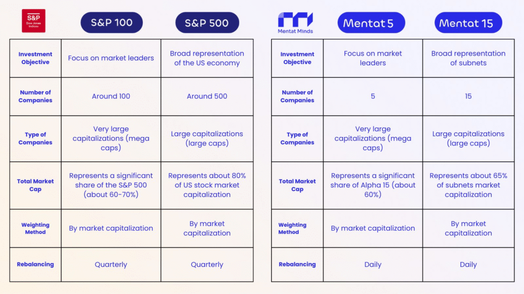 b. Diversify through indexes. Mentat Minds offers curated subnet indexes like Mentat 5 and Mentat 15, similar to S&P 100 and S&P 500-style bundles respectively.
