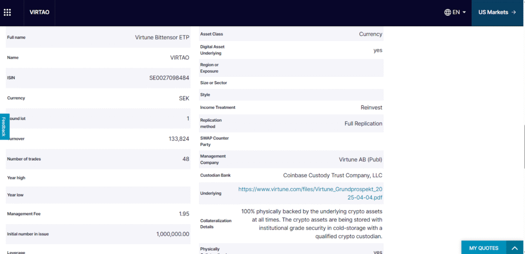 Key details of the Virtune Bittensor ETP include: