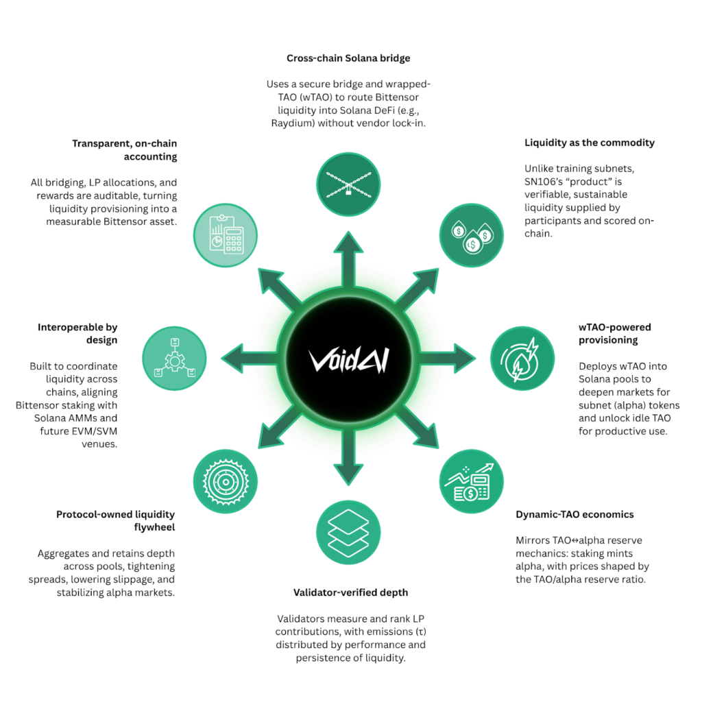 VoidAI, grounded on Subnet 106, is a dedicated Bittensor subnet designed to coordinate on-chain liquidity for Bittensor’s $ALPHA by connecting them to external DeFi ecosystems, starting with Solana.