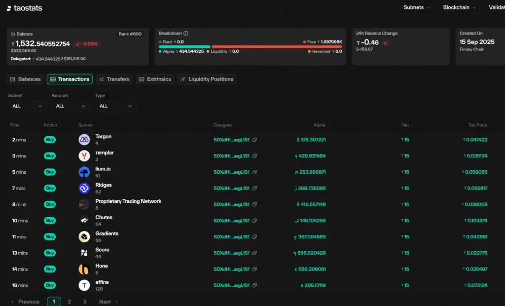 The Bittensor ecosystem has been abuzz with speculation following a series of intriguing wallet movements tracked by analyst Michael D. White. A prominent wallet, widely believed to be linked to Yuma—a subsidiary of Digital Currency Group (DCG) focused on advancing decentralized AI—has been actively investing approximately $1 million in TAO tokens across various subnets.