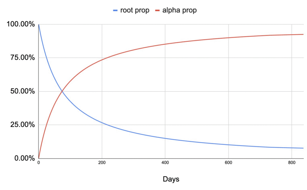 Root APY comes from the validator’s staking rewards. Some of the rewards go to alpha hodlers, and some to those who stake on root. You probably recall this chart from when dTao launched: