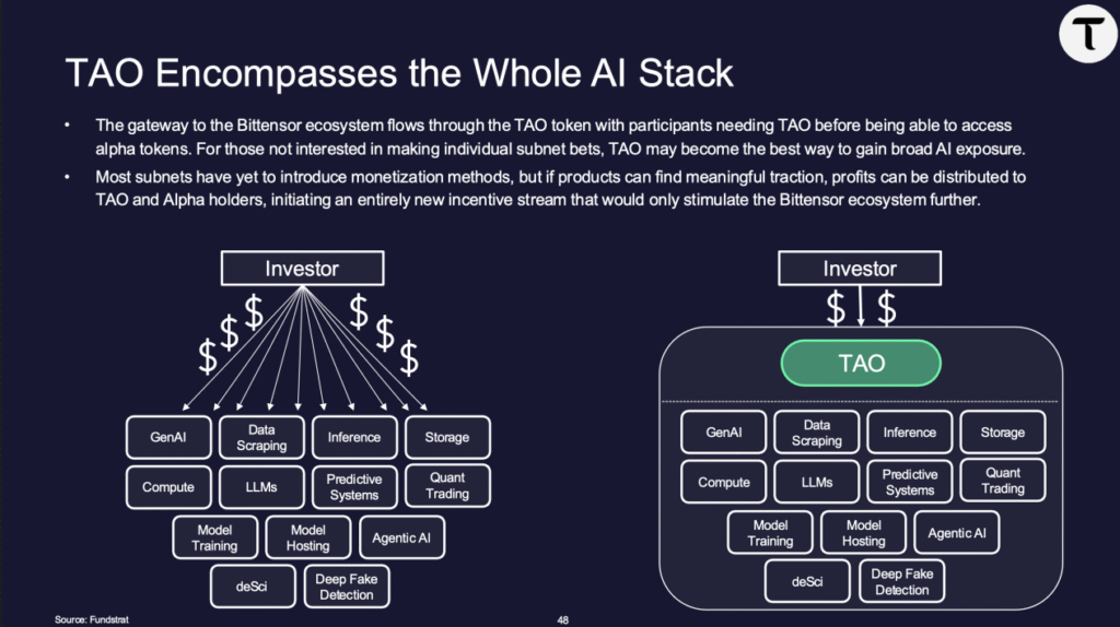 - NVIDIA dominates AI through its GPUs, which power 80-90% of AI training; similarly, Bittensor could become the “infrastructure layer” for decentralized AI in crypto.