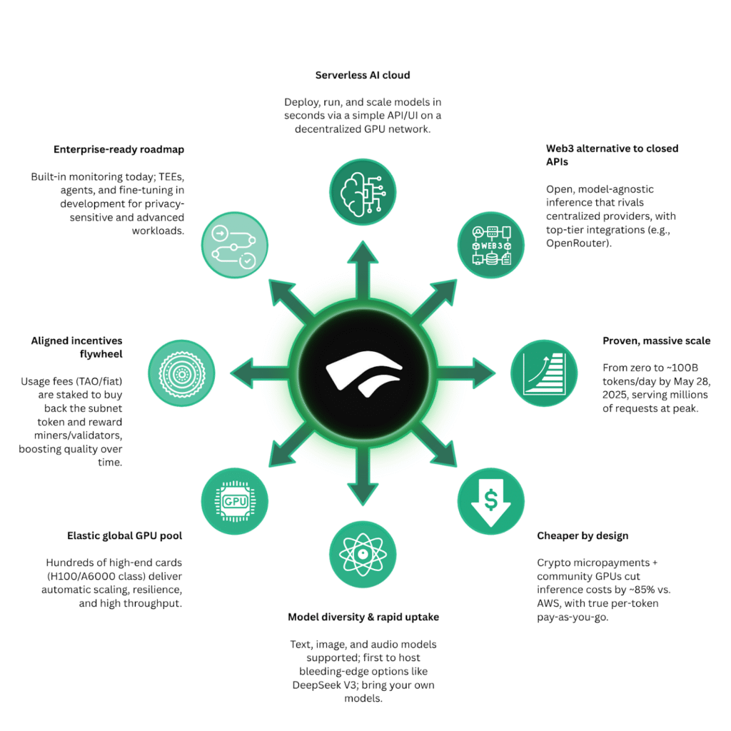 Chutes provides serverless AI inference in a decentralized format through which developers can deploy and run models without managing GPUs, servers, or scaling logic.