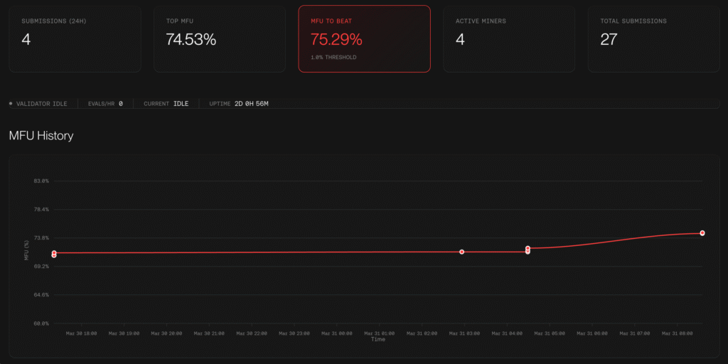 Crusades is not the old decentralized training protocol. It is a live MFU (Model FLOPs Utilization) optimization competition. Miners no longer train the full model from scratch. Instead, they submit a single train.py file containing an inner_steps() function. Validators then run that exact code on standardized hardware (typically 4× A100 GPUs) and measure the MFU score—the percentage of theoretical peak FLOPs actually used for useful training work. The highest MFU wins.
