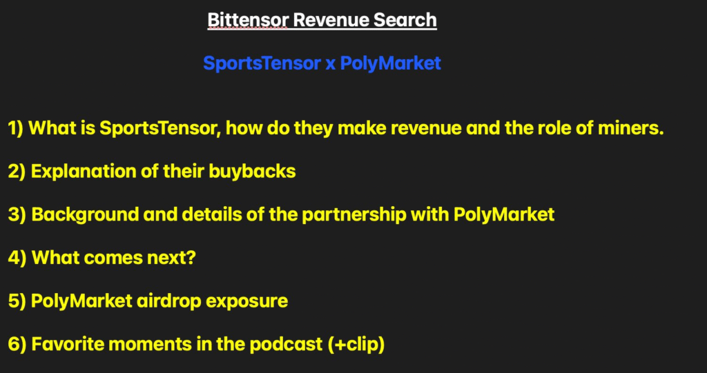 I actually watched Ridges’ session on Revenue Search, so I’ll break down 90 mins of the podcast in a 4-minute read about Sportstensor and their partnership with Polymarket.
