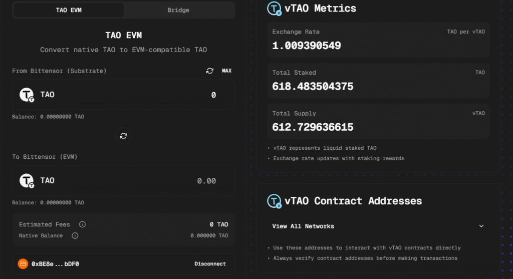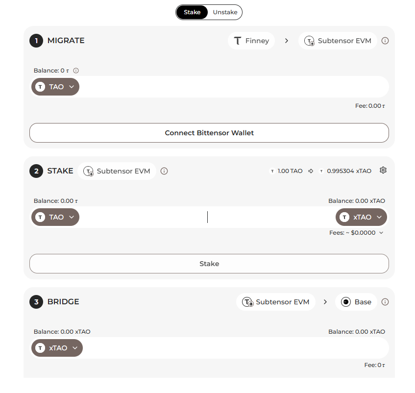Users are able to migrate, stake, and bridge their TAO and subnet alpha via the Rubicon bridge interface. After sending TAO (or alpha) to the Bittensor EVM, users can wrap and stake for xTAO and xAlpha. These wrapped tokens can be bridged to Ethereum, Base, Optimism, or Arbitrum, all while retaining staking yield.