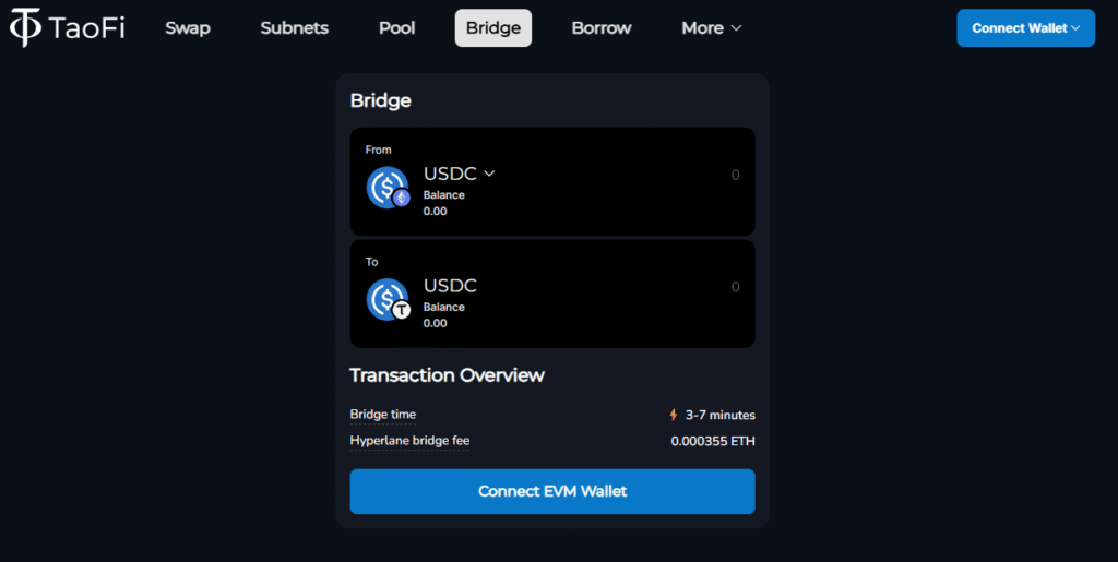 USDC to EVM TAO and Alpha (Taofi)