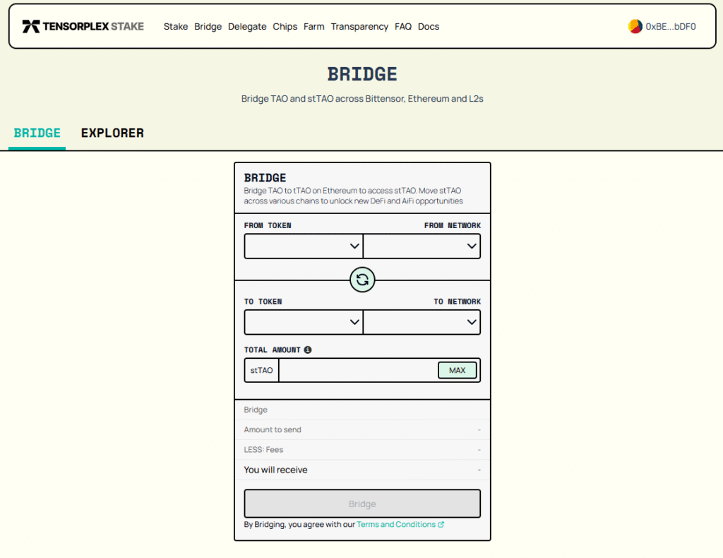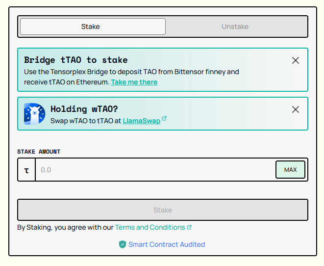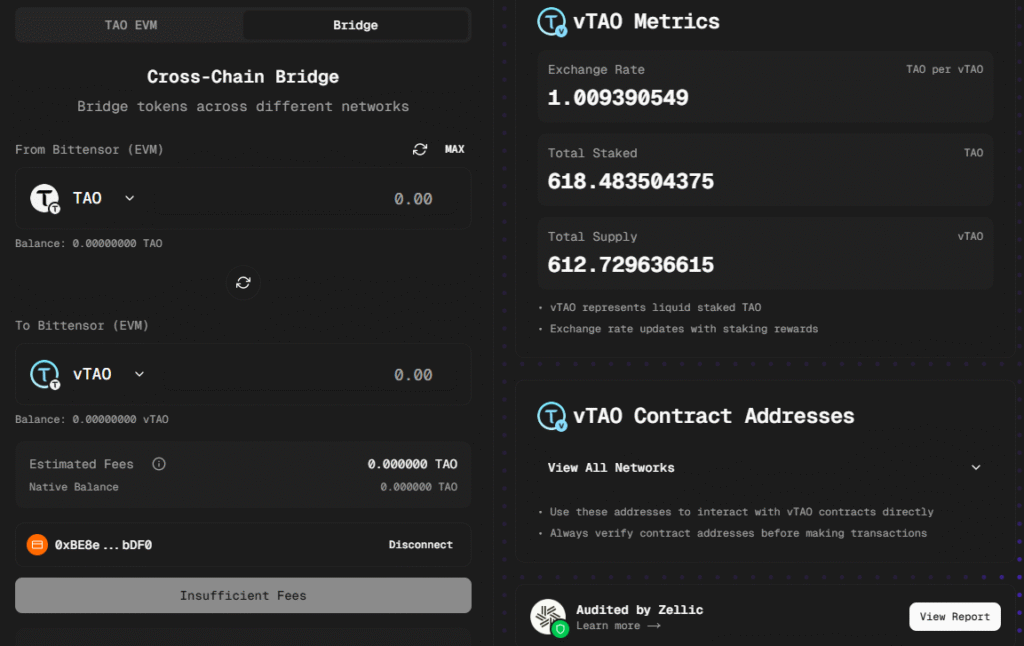 Once native TAO is bridged to tTAO, it can be deposited and staked on their staking page. This converts tTAO to stTAO, allowing holders to retain yield on their TAO deposits. stTAO’s contracts were audited by Quantstamp. The current APY of stTAO is 22.30% in accordance to their Transparency Dashboard, and should match the root APY on Bittensor.