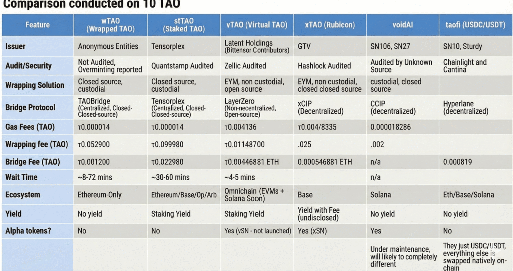 The wrapped TAO and subnet alpha token landscape has rapidly evolved from Creative Builds’ pioneering wTAO bridge in early 2023 to a diverse ecosystem of solutions spanning multiple blockchains today.
